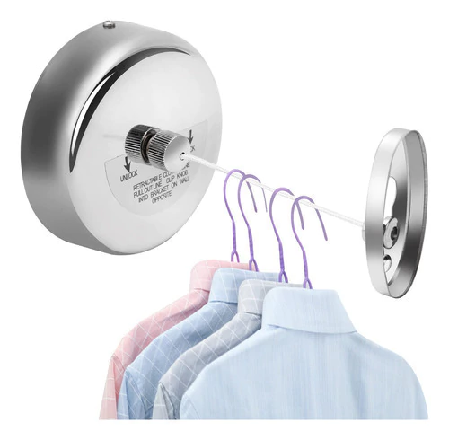 Tendedero Retráctil De Acero Inoxidable 304 con diseño ajustable para espacios de hasta 2,8 metros. Fabricado en acero inoxidable 304 de alta resistencia. Cuerda de nailon robusta y duradera, resistente a la rotura. Capacidad de carga de la cuerda de hasta 5 kg. Diseño sin poleas para evitar desgaste de la cuerda.