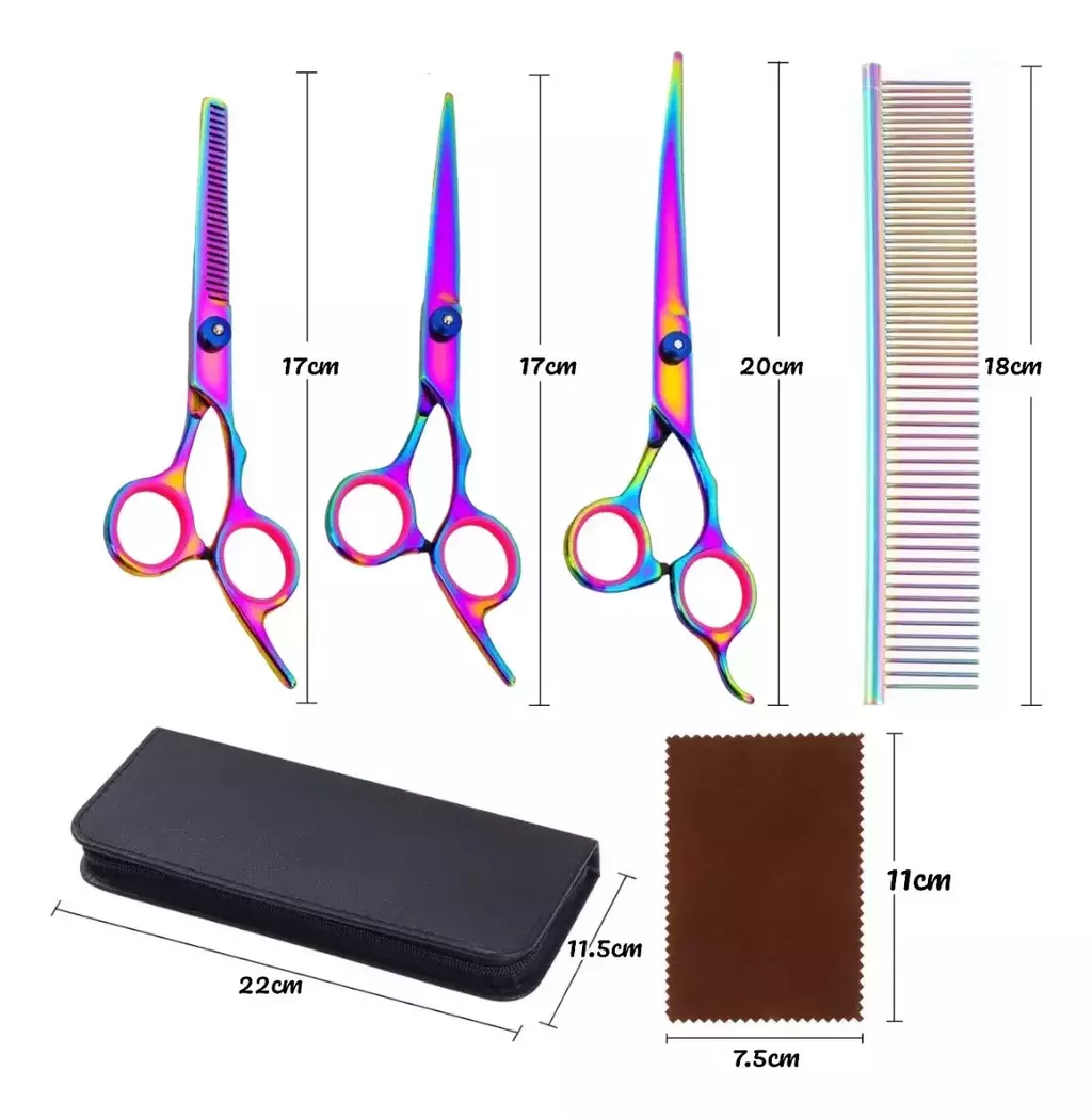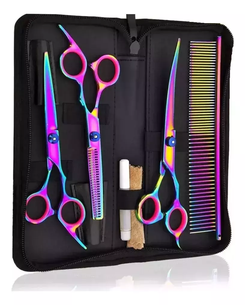 El completo kit incluye tijeras esenciales como rectas, curvas hacia arriba y esculpidoras de entresacar, un peine recto, además de un estuche de tijeras y un pañuelo de limpieza. Estas tijeras de acero inoxidable de alta calidad son duraderas y afiladas, con un atractivo revestimiento tornasol. Son ajustables y de bajo ruido, ideales para recortar zonas sensibles en diversas personas. La bolsa portátil facilita la organización y el transporte. Este kit es esencial para el cuidado personal.