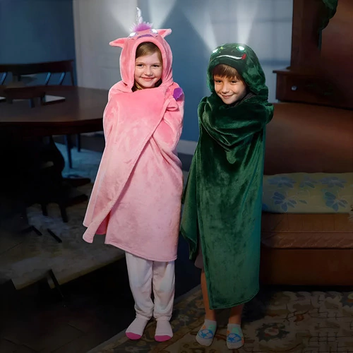 . Nuestra manta con capucha súper suave tiene ojos de luz LED para doble diversión, incluso en la oscuridad como una acogedora capa mágica con capucha